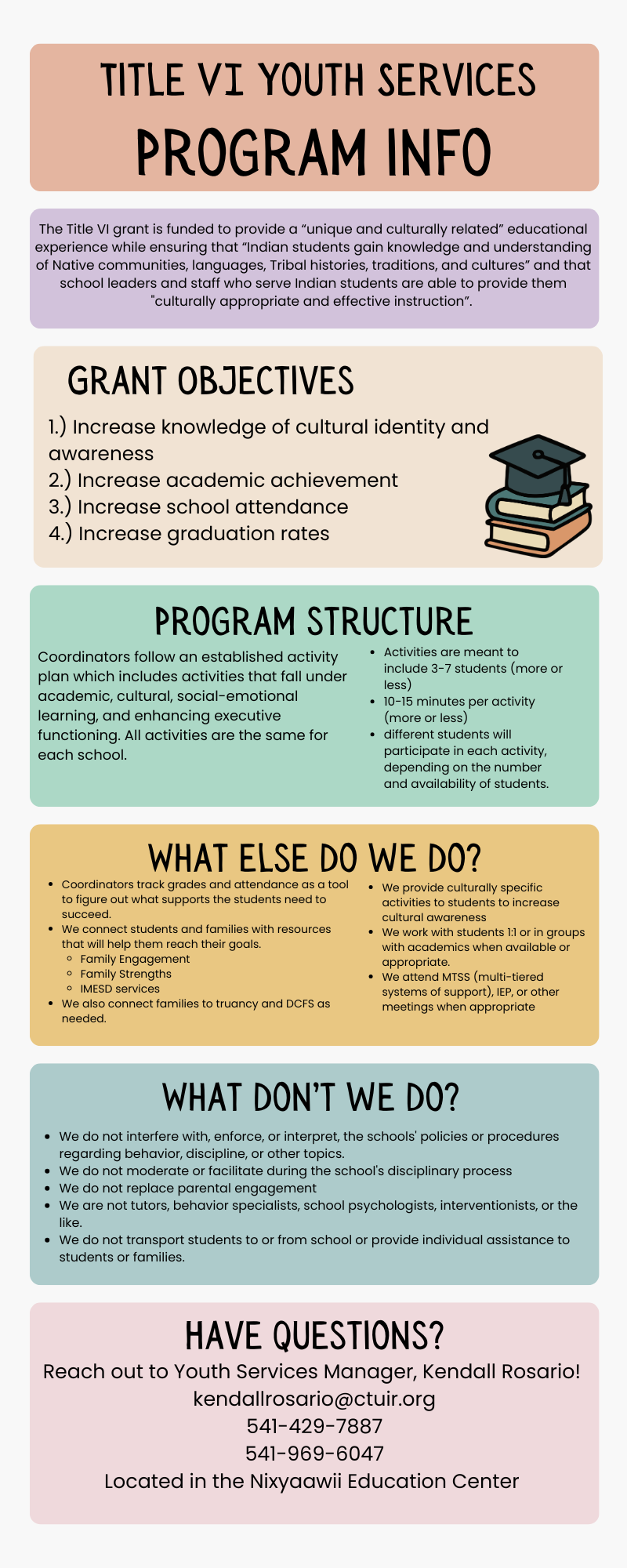 The Youth Services team strives to provide the support our students need to succeed by making sure they and families are connected to necessary resources, receiving academic assistance, and are participating in Indigenous Ways of Knowing, with the goal of increasing graduation rates and preparing students for economic sovereignty.