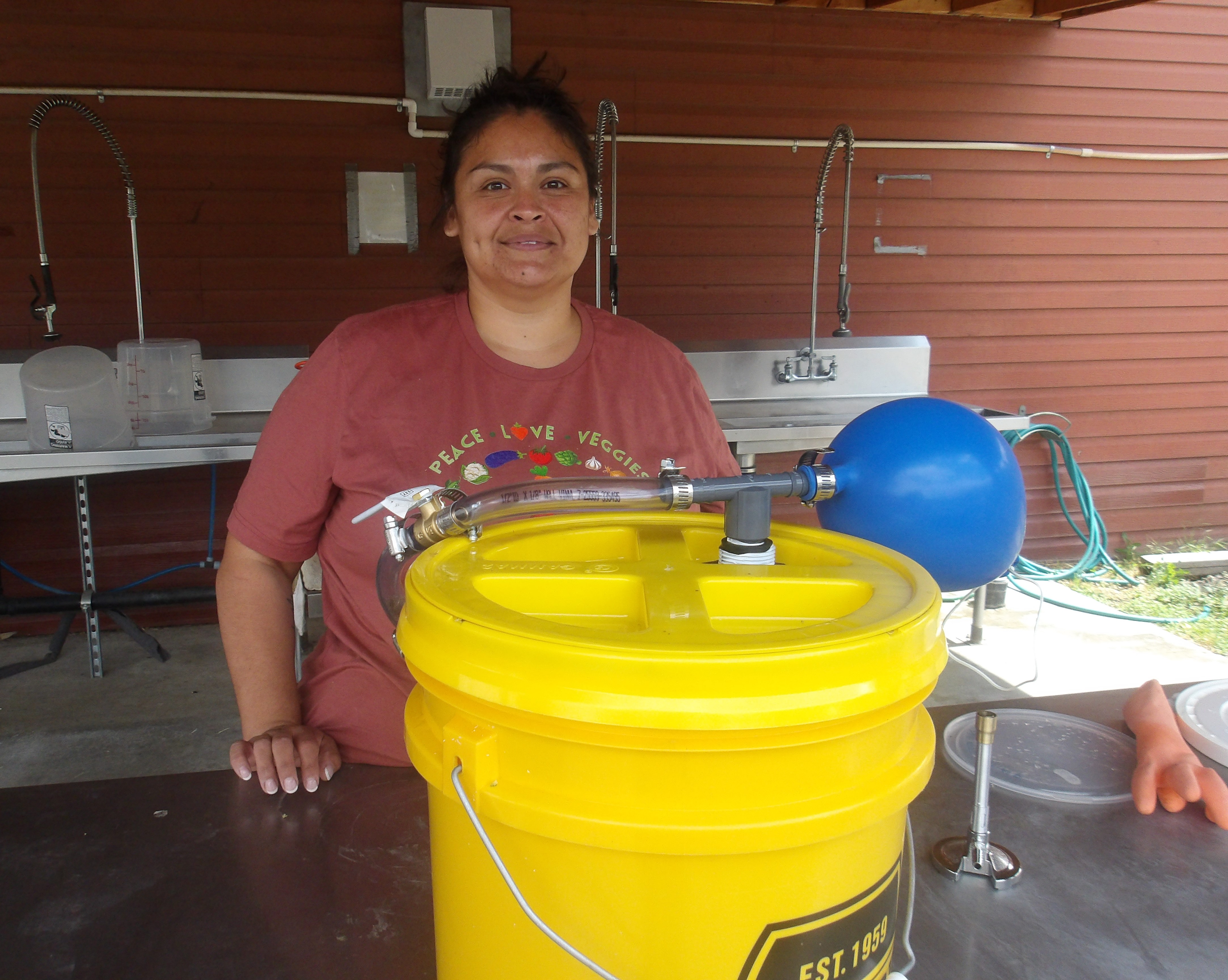DeArcie Abraham, project manager and operator of Biowaste Technologies, shows off a modified version of the Aqpas design, lovingly dubbed "Aqpas 01" as our project team investigate potential for biogas from food waste (FFPP July 2025)