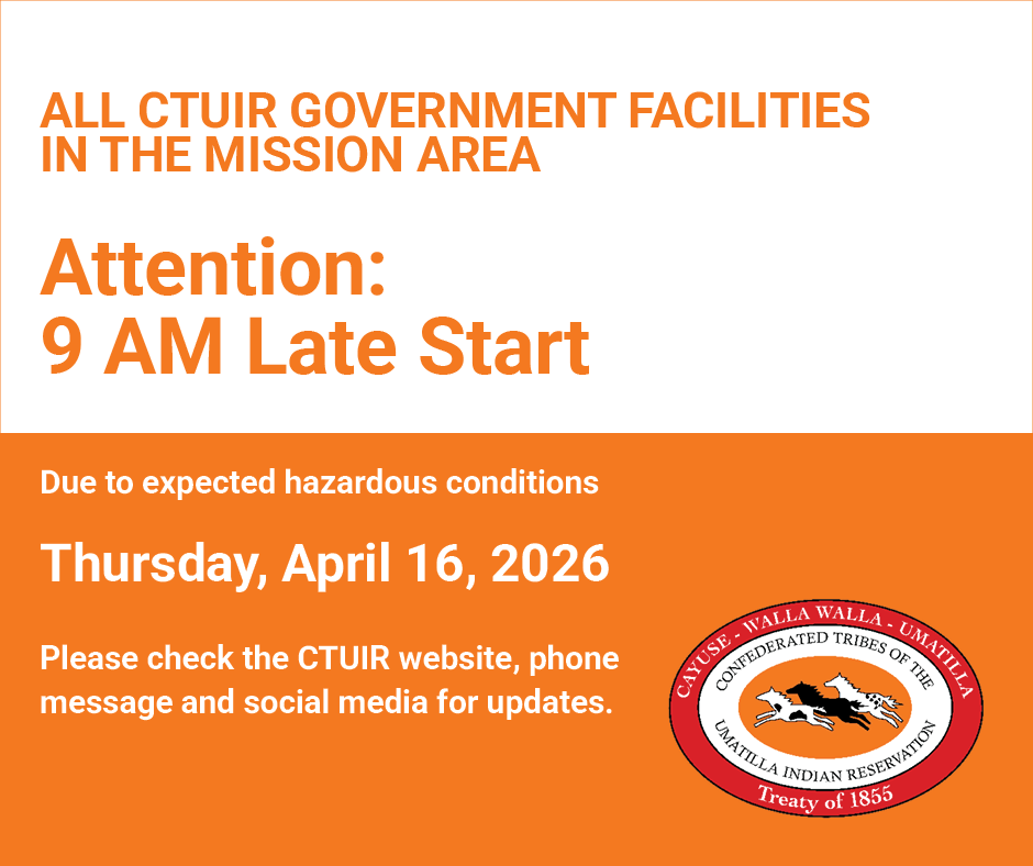 Due to expected hazardous conditions, all CTUIR government facilities in the Mission area will open at 9 a.m. on Thursday, April 16. Employees at facilities outside the Mission area please coordinate with your supervisors and directors if there are adverse weather conditions in your location.